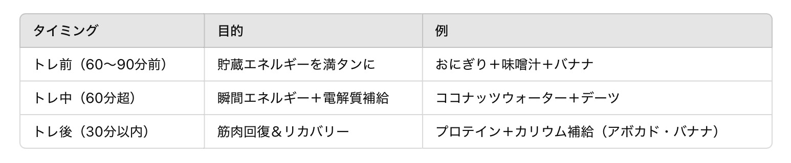 | 有酸素やHIIT | 電解質+炭水化物補給+必要なら少量のタンパク質 |